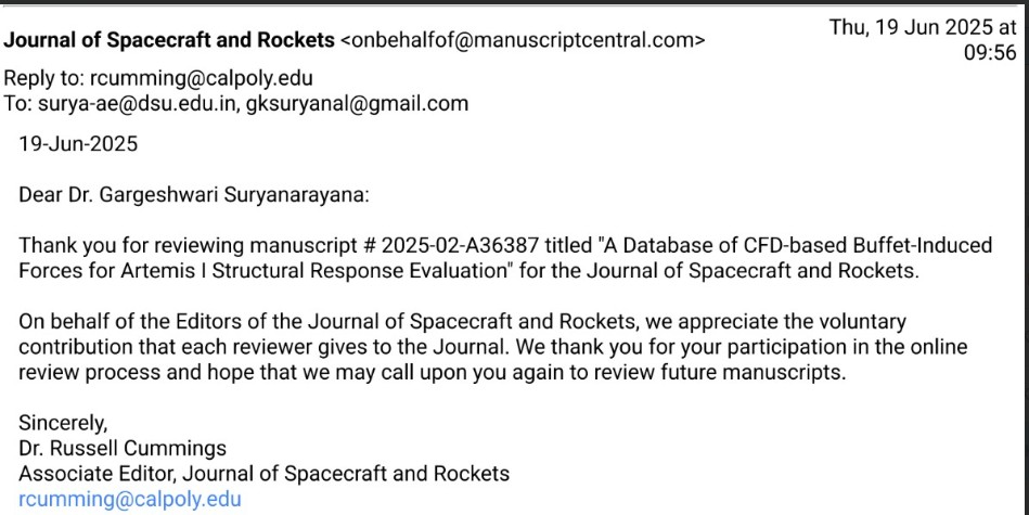 Dr. Suryanarayana GK, Professor, reviewed a paper titled "A Database of CFD-based Buffet-Induced Forces for Artemis I Structural Response Evaluation" for the Journal of Spacecraft and Rockets. He also reviewed papers for Physics of Fluids, an AIP Publishing journal.