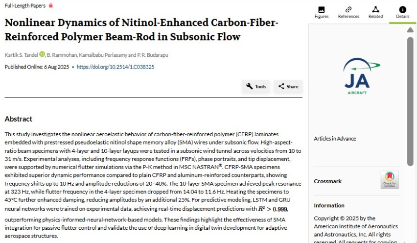 Prof. Kartik S Tandel published a research paper titled “Nonlinear Dynamics of Nitinol-Enhanced Carbon-Fiber-Reinforced Polymer Beam-Rod in Subsonic Flow” in the Journal of Aircraft.