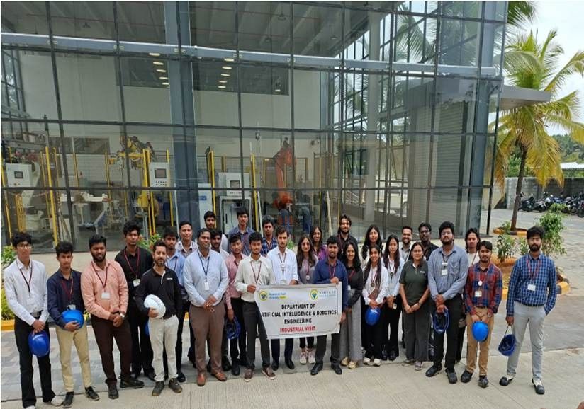 The Department of Artificial Intelligence & Robotics organized an industrial trip to Moog India Technology Center, Bengaluru, involving both faculty and students to strengthen practical exposure to advanced industrial technologies. The visit provided insights into precision motion control, industrial robotics, embedded systems, and AI-enabled automation solutions used in aerospace, manufacturing, and high-performance engineering domains. Faculty members interacted with industry experts to understand evolving skill requirements and emerging technological trends, contributing to curriculum enrichment. Students observed real-time engineering workflows, safety practices, and system integration methodologies adopted in global industrial environments. The trip reinforced the importance of interdisciplinary knowledge combining AI, robotics, control systems, and embedded intelligence.