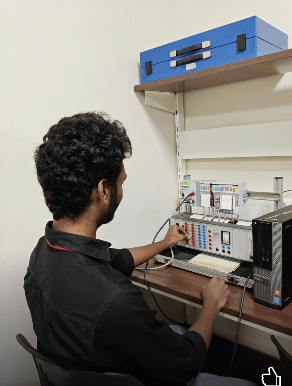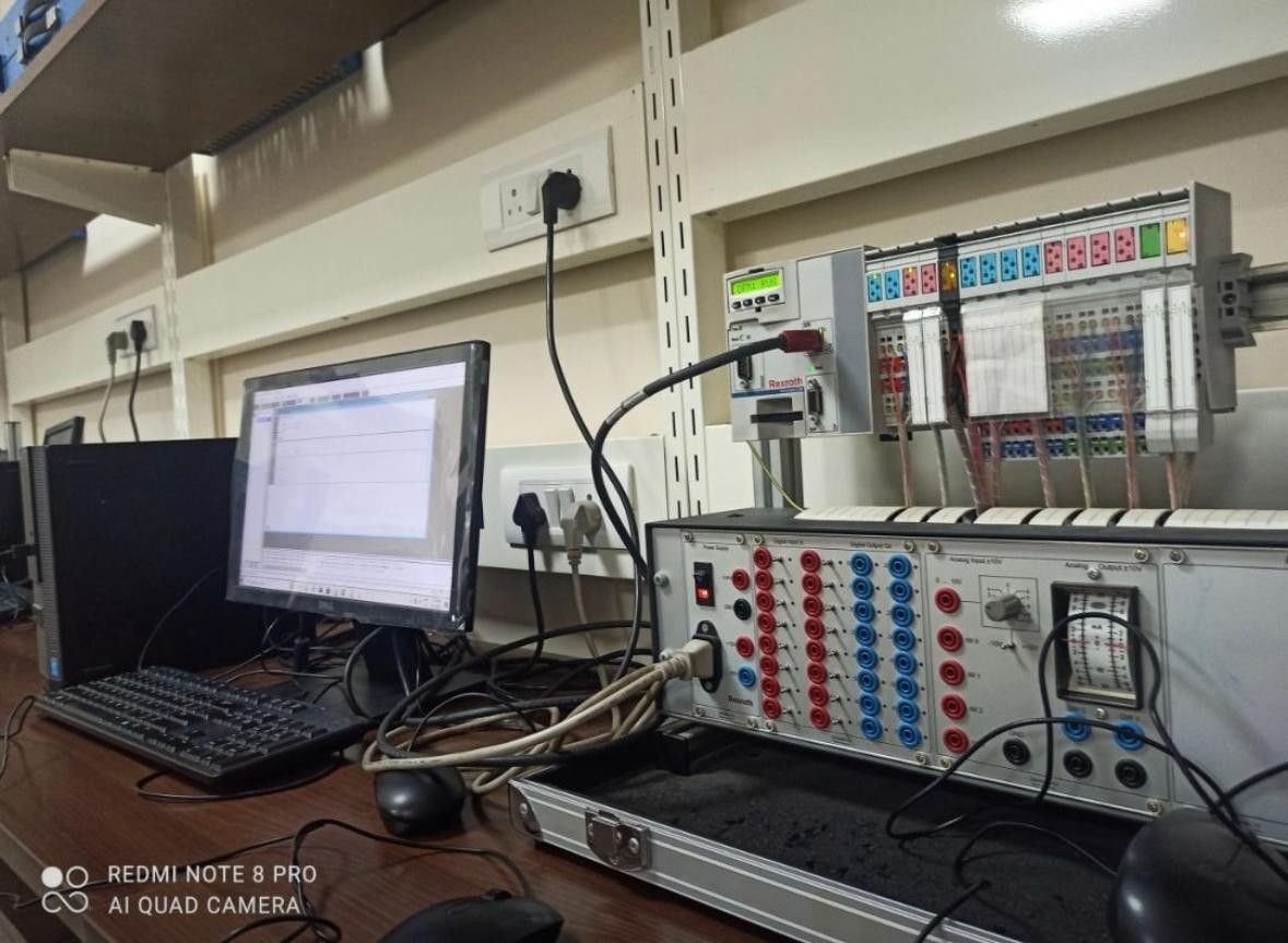 The laboratory is equipped with industry-grade PLC trainers and automation hardware from leading manufacturers, along with Human–Machine Interface (HMI) panels, SCADA integration tools, variable frequency drives (VFDs), sensors, and actuators. Industry-standard software platforms are used for PLC configuration, simulation, debugging, and real-time monitoring of control systems.