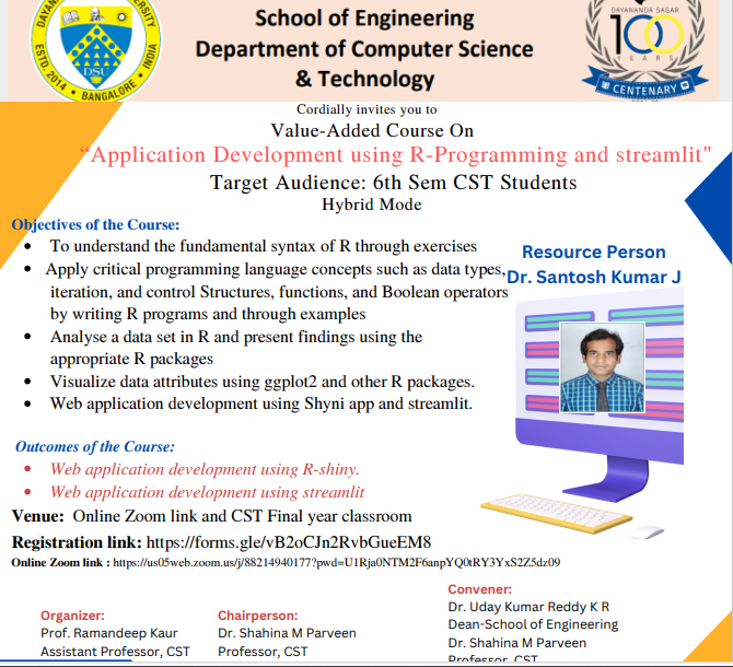| 07-07-2023 to 18-08-2023 | Value Added Course | Application Development using R-Programming and Streamlit | ![]() |