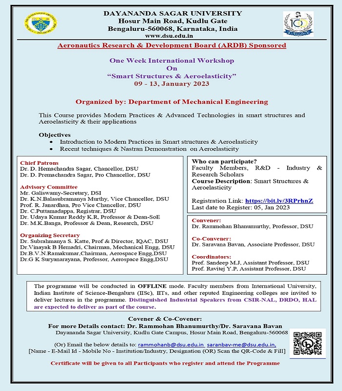 Department of Mechanical Engineering, Dayananda Sagar University, is organizing One Week International Workshop On “Smart Structures & Aeroelasticity”, Sponsored by Aeronautics Research & Development Board (ARDB) from 9-13 January 2023