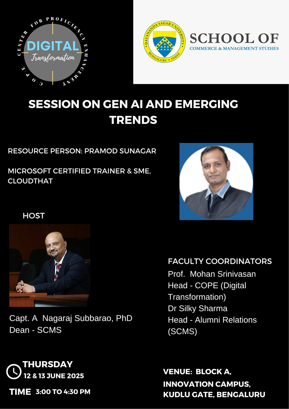 Continuing the philosophy of academic enrichment and nurturing industry ready talent, the Digital Transformation - Centre of Proficiency Enhancement (DT COPE) will equip DSU MBA students with hands-on experience on Digital tools and processes in select business domains. In this regard, this session will help connect with Industry professionals to bring practical perspectives and practices of Digital Technologies in Financial Domain for the students.