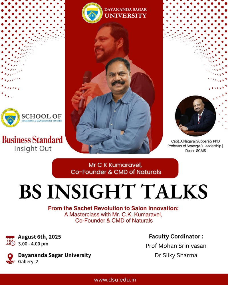 “Ideas to Influence – A Brand Narrative Masterclass” is a one-day MDP designed to help participants understand how powerful narratives shape brand identity, communication, and customer connection. Scheduled for 13th December 2025 at the DSU Kudlu Gate Campus (9:30 AM – 4:30 PM), this masterclass brings together three dynamic resources: Prof. Jiten Patri, Nishant Poddar (CMO, Wrogn) and RJ Rubina Patel (Red FM). Through engaging sessions and hands-on activities, participants will learn how to craft meaningful brand stories, build a strong personal and professional presence, and use voice, creativity, and strategy to create lasting influence. Open to students, alumni, marketing professionals, and leaders, this MDP offers a unique opportunity to elevate your brand and communication skills.