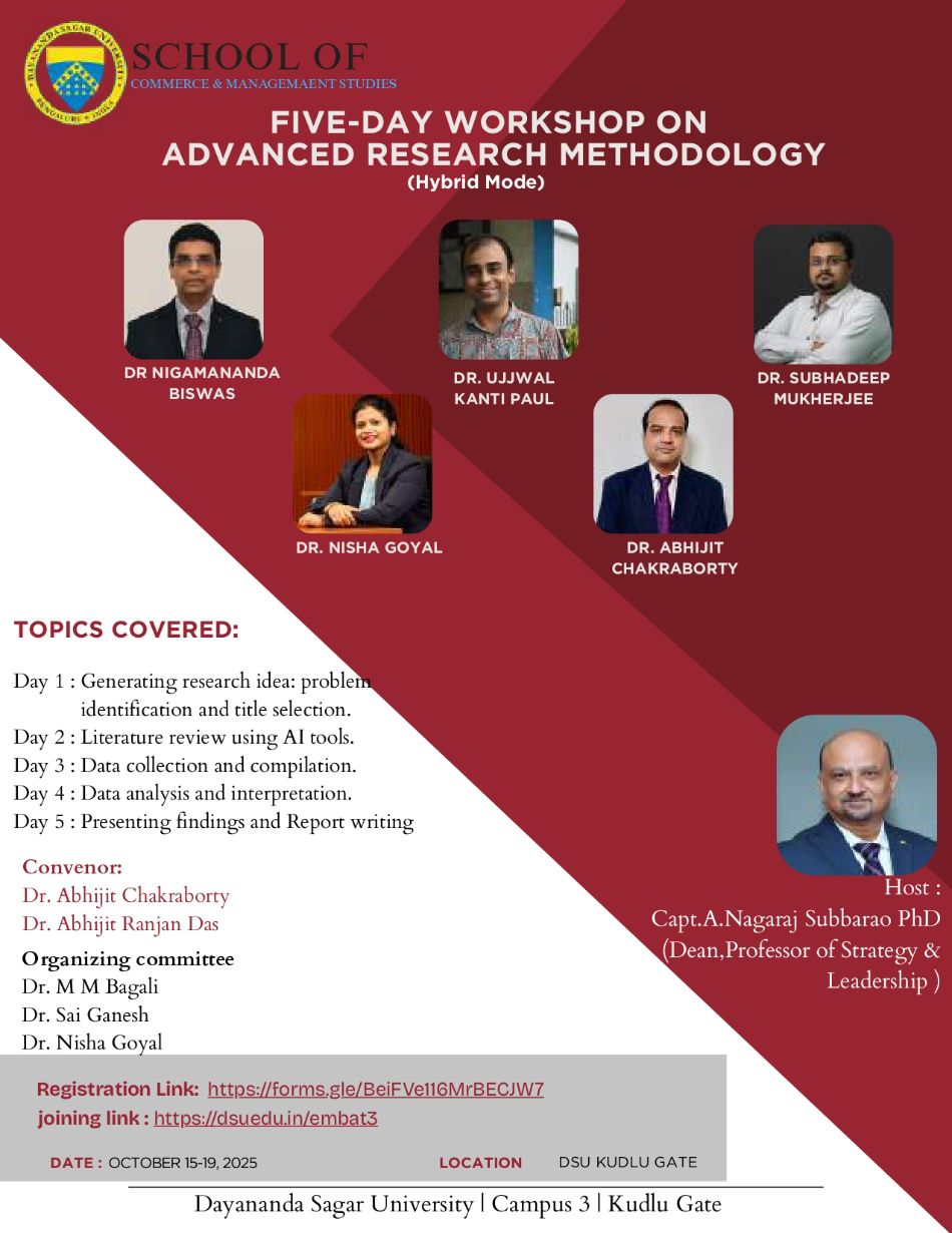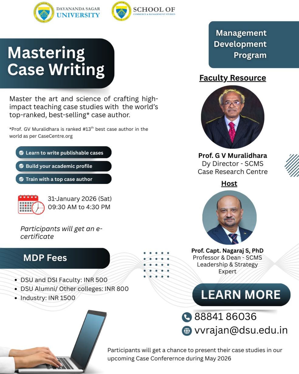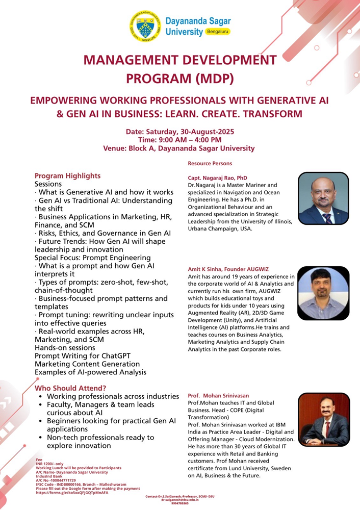You are requested to join School of Commerce and Management Studies, City Innovation Campus, Dayananda Sagar University for this 1-DAY MDP as per below schedule.