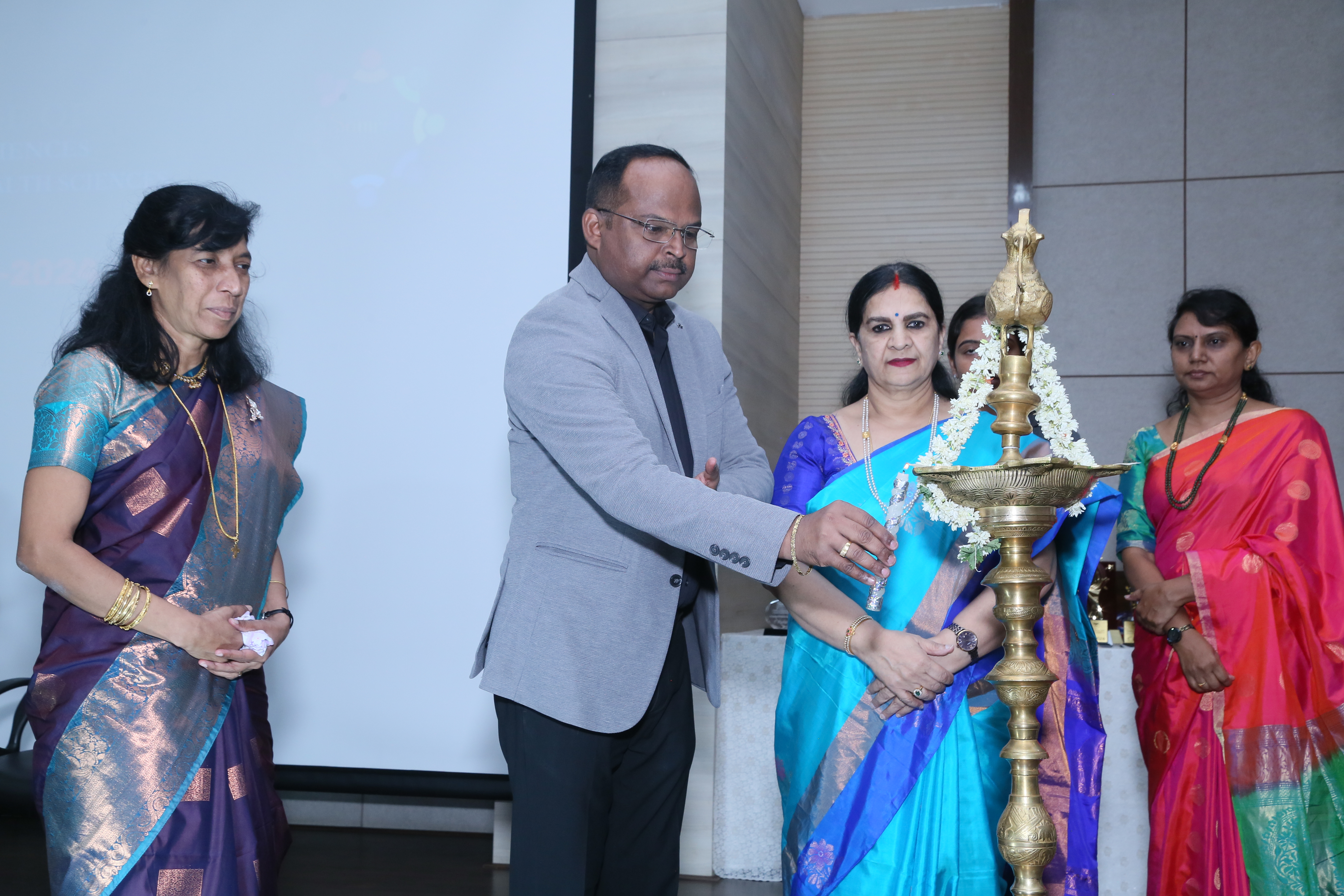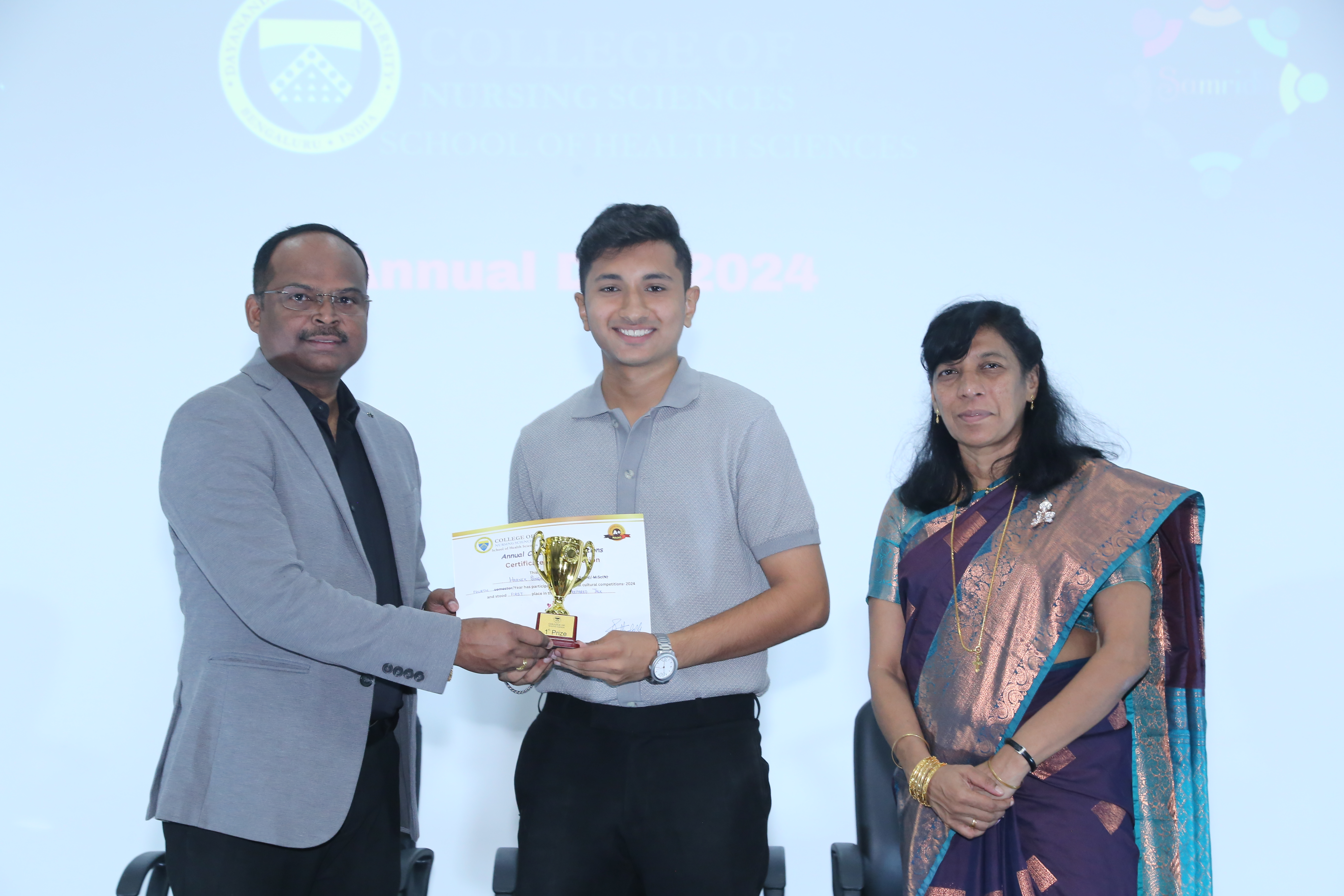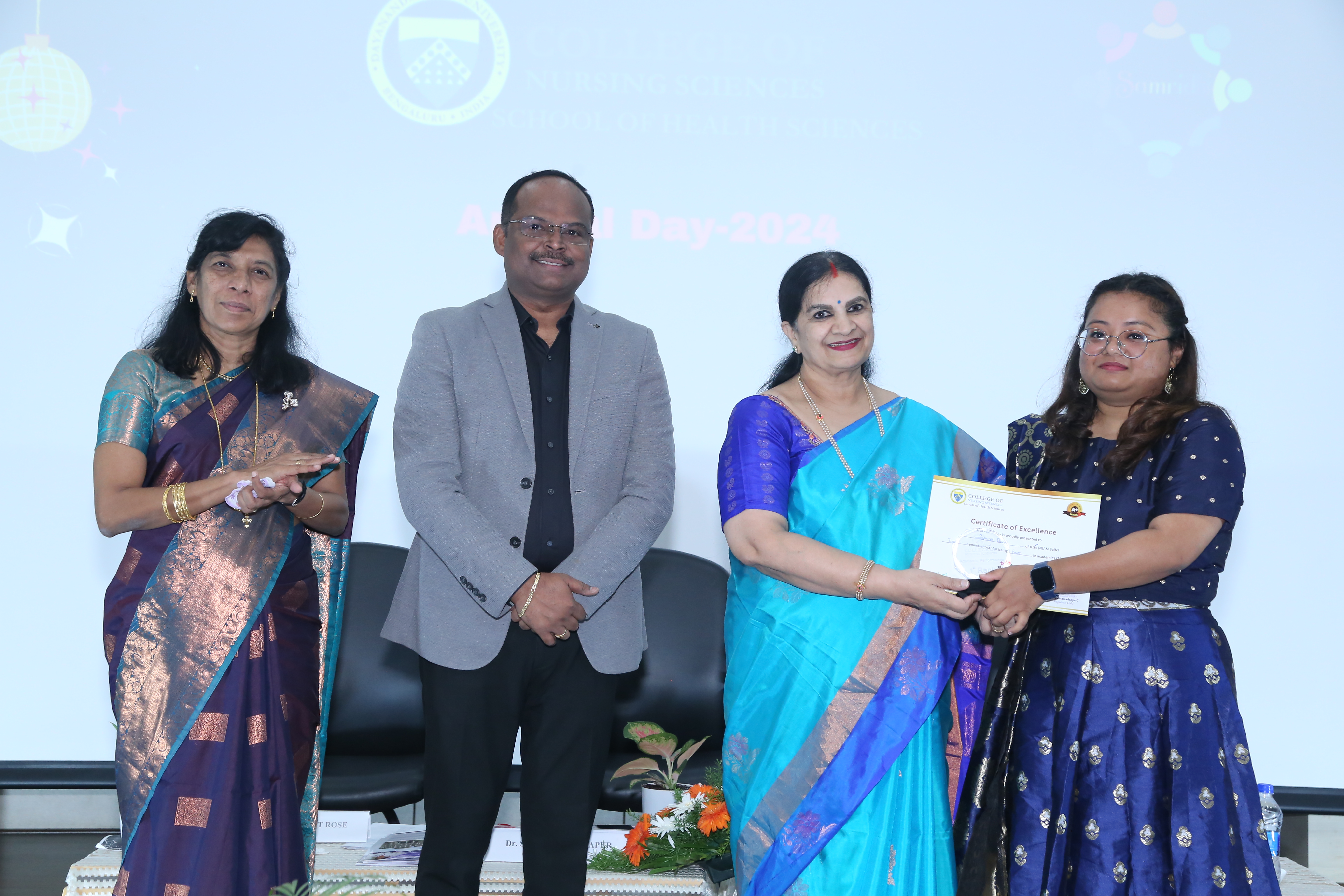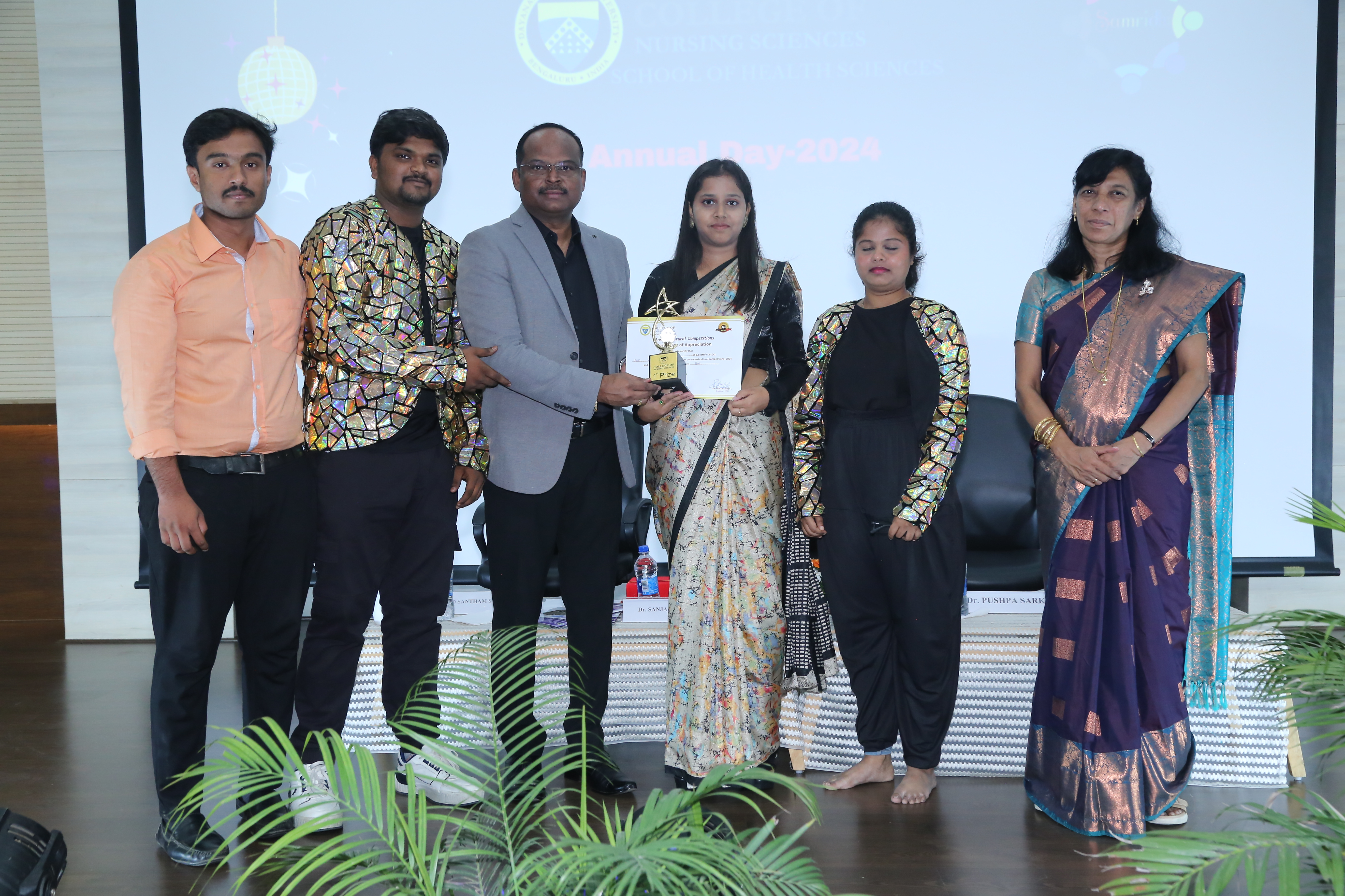The College of Nursing Sciences at Dayananda Sagar University celebrated its Annual Day with great enthusiasm on July 13, 2024. The event began with the traditional lighting of the ceremonial lamp by distinguished guests. Dr. Sanjay M. Peerapur, Principal of KLES Institute of Nursing Sciences, Hubli, graced the occasion as the chief guest and delivered an inspiring speech, highlighting the importance of holistic education and motivating students to pursue their dreams with dedication and hard work. Dr. Santham Sweet Rose, Principal of the College of Nursing Sciences, presented the Annual Report, while Dr. Pushpa Sarkar, Dean of the School of Health Sciences, addressed the gathering and congratulated all the prize winners. The award ceremony was one of the event’s highlights, honoring students for their achievements in academics, sports, and cultural activities. The day also featured vibrant performances by the students, adding to the celebratory atmosphere.