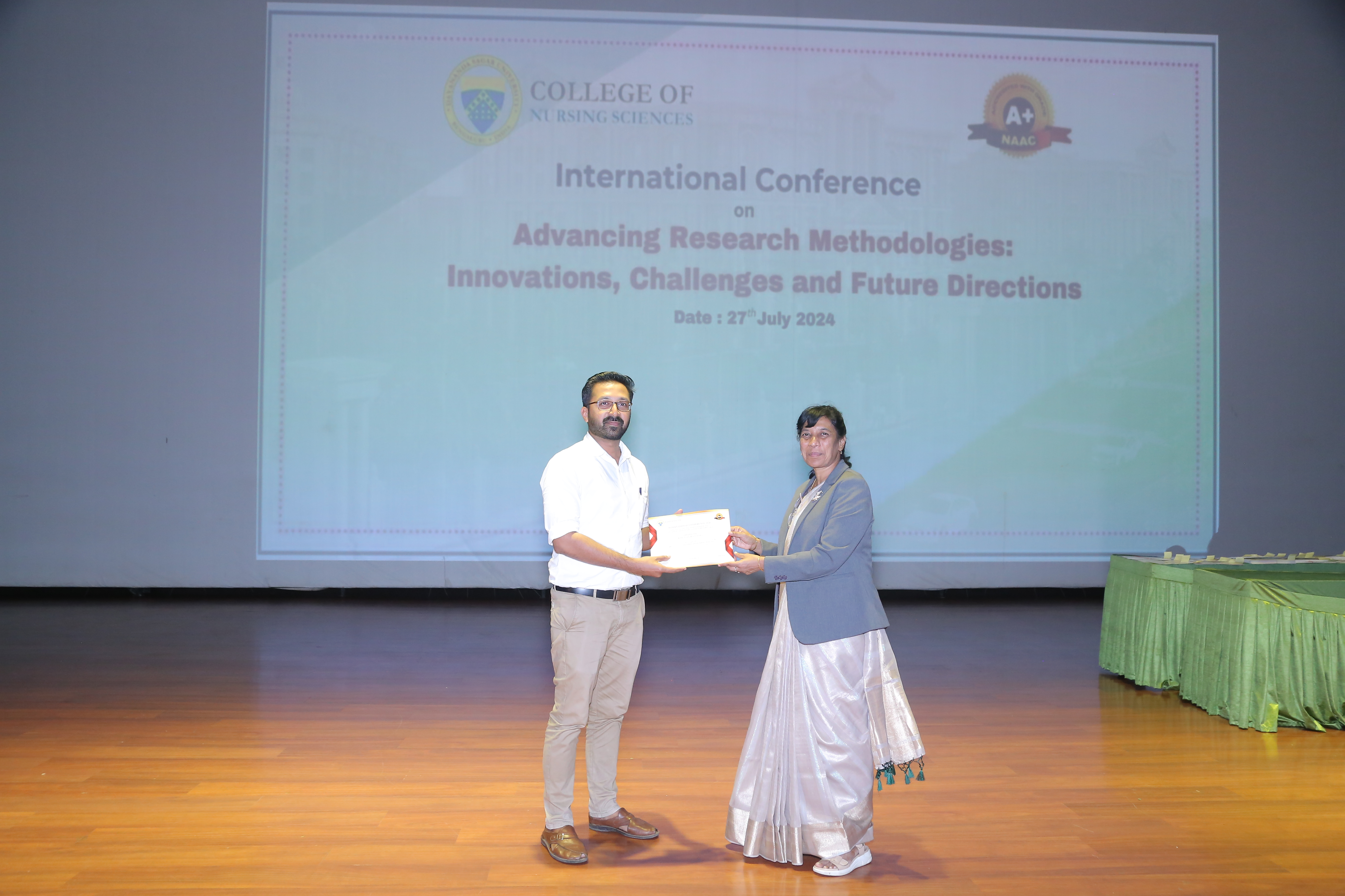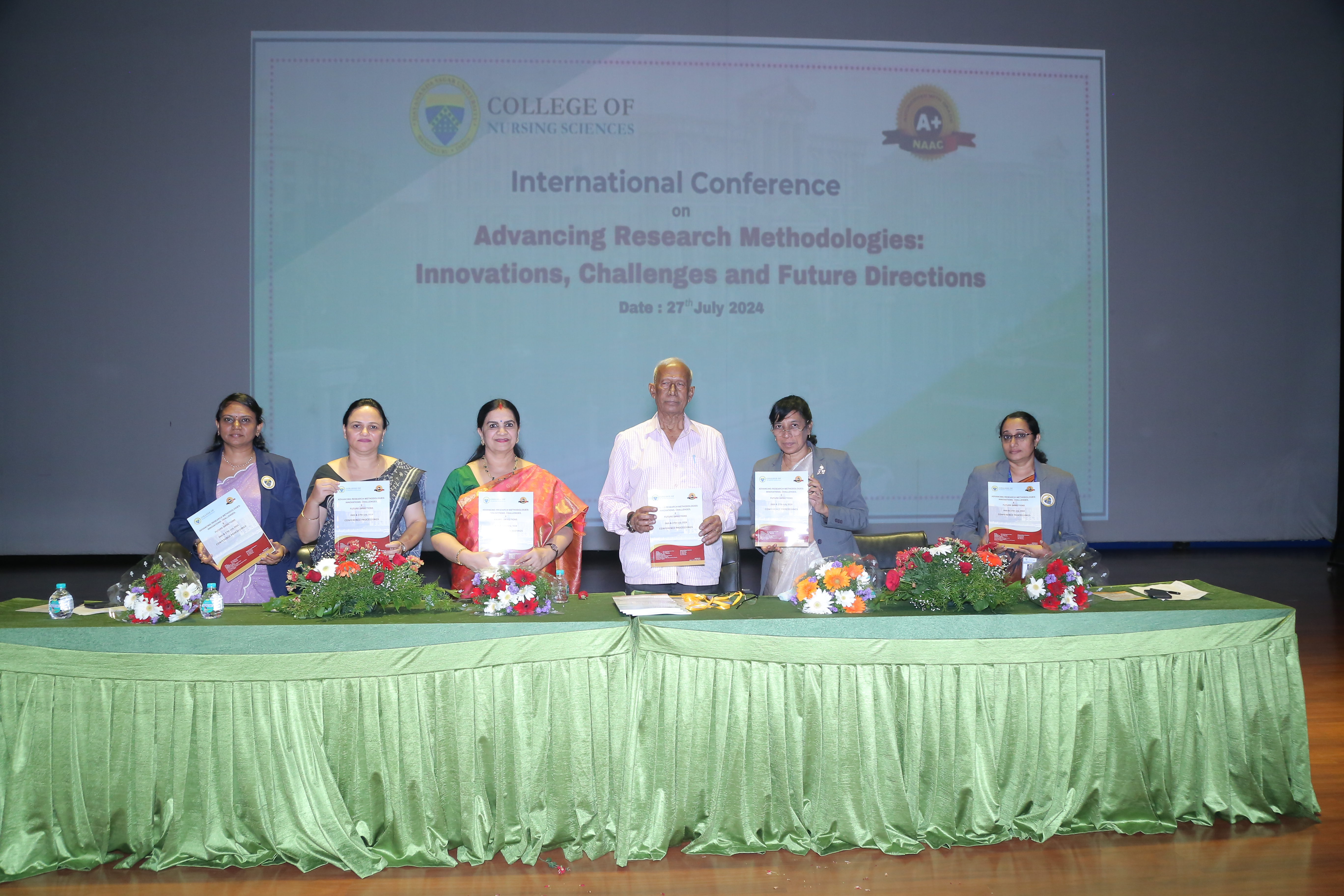 The College of Nursing Sciences, DSU, organized an International Conference on "Advancing Research Methodologies: Innovations, Challenges, and Future Directions" over two days, 26th and 27th July 2024. Shri. Galiswamy Sir, Secretary of the Mahatma Gandhi Vidyapeet Trust, was the Guest of Honor for the conference, which was presided over by Dr. Pushpa Sarkar, Dean of SHS. The conference featured a distinguished panel of resource persons Dr. Vishnu Renjith, Lecturer & Programme Director, School of Nursing and Midwifery, Royal College of Surgeons in Ireland (RCSI), Dr. Mamatha S Pai, Professor, Department of Child Health Nursing, Dr. Shalini G Nayak, Assistant Professor, Department of Medical-Surgical Nursing, Mr. Anil Raj A, Assistant Professor, Department of Medical-Surgical Nursing, Manipal College of Nursing, MAHE, Manipal, Dr. Shejila C H, Professor, Department of Medical-Surgical Nursing, Dr. Santham Sweet Rose, Professor and Principal, CONS, DSU, Dr. Latha T, Associate Professor, College of Nursing, AIIMS Kalyani, West Bengal, Dr. Ramesh C, Associate Professor, Department of Medical-Surgical Nursing, SRIHER, Chennai, Dr. Leena KC, Professor and Principal, College of Nursing, Yenepoya Deemed to be University, Mangalore, Dr. Vani Lakshmi R, Assistant Professor, Department of Data Science, Prasanna School of Public Health MAHE, Manipal, Dr. Darshan B B, Assistant Professor, Department of Community Medicine, Government Medical College, Chamarajanagar, Dr. Judie Arulappan, Associate Professor & Director of Nursing, Laboratory and Simulation Unit, College of Nursing, Sultan Qaboos University, Oman. The Karnataka State Nursing Council awarded 8 credit points for the conference, and Mrs. Nicola Sharon Ambrose, Principal of Manjushree College of Nursing, was appointed as an observer by the KSNC. Awards were given for the best papers and posters, and the conference saw around 810 participants from Karnataka, Kerala, Andhra Pradesh, and West Bengal, marking it as a grand success.