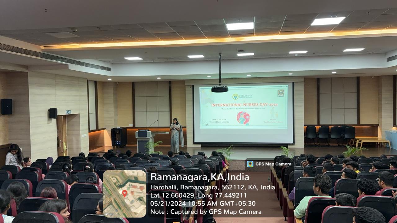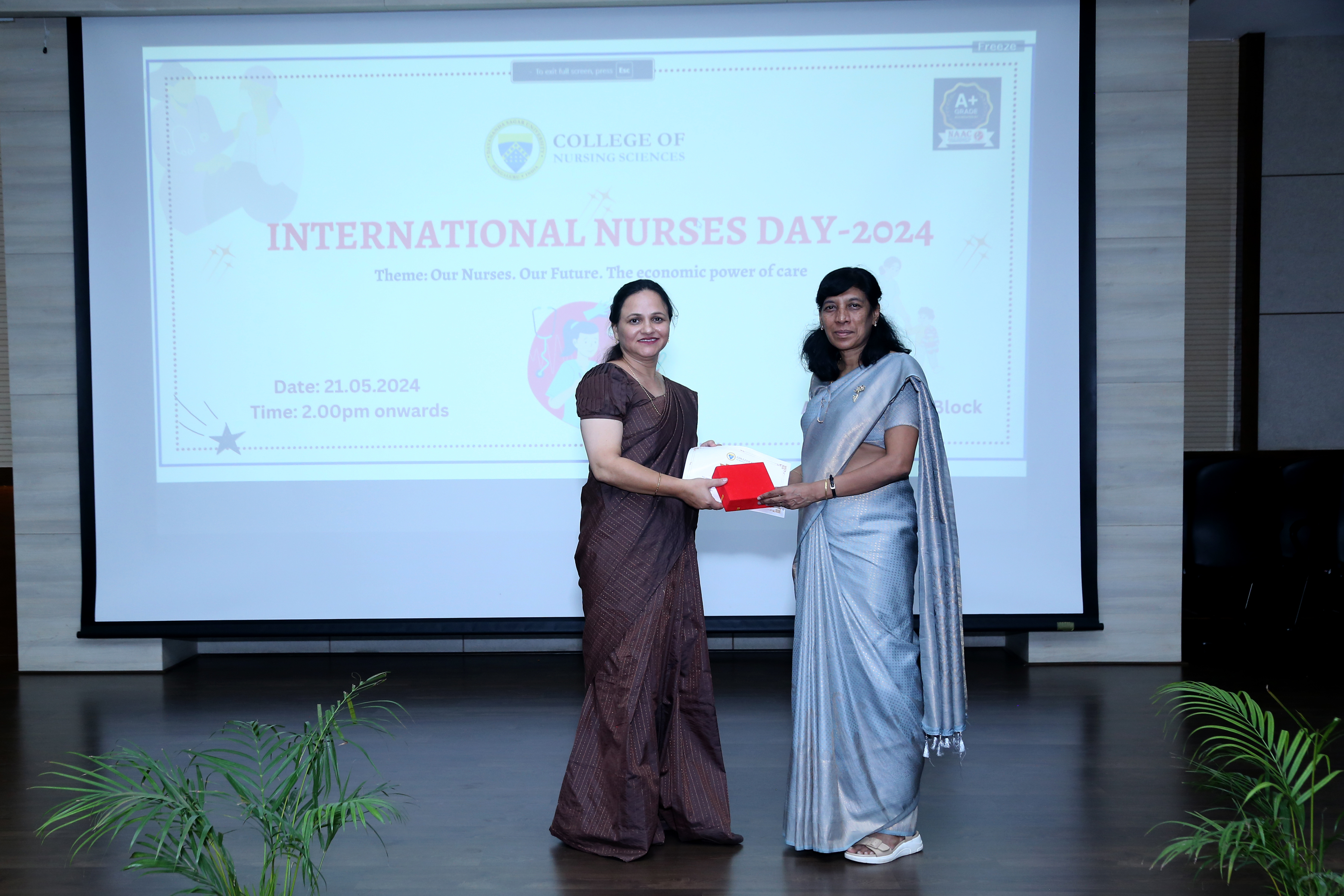 The College of Nursing Sciences, DSU celebrated International Nurses Day on 21st May 2024 at F-Block auditorium from 10.00 am onwards. Program started with the competitions for all the students Dance (Solo and Group), Just A Minute, Dumb Charades. Prof. Nicola Sharon Ambrose, Dean, Manjushree Institutions, Bangalore was the Chief Guest for the event. She addressed insisting the importance of having passion towards Nursing profession and following the footpaths of the eminent nursing leaders. Dr. Pushpa Sarkar, Dean, SHS, DSU wished the very best for the students and Dr. D. Santham Sweet Rose, Principal encouraged the student nurses to have more compassionate care.