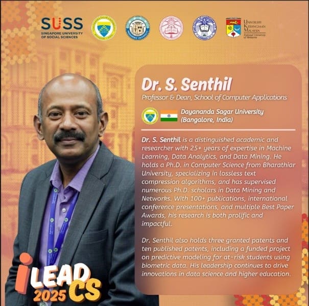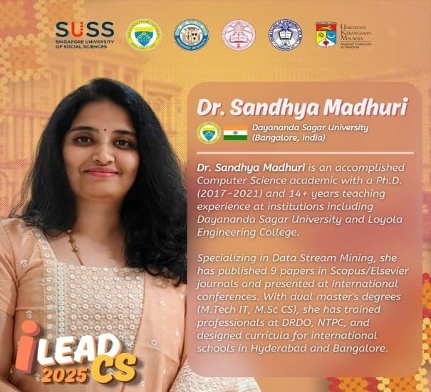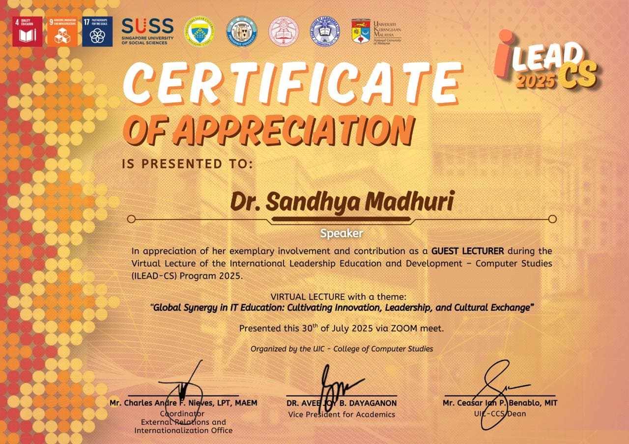 Dayananda Sagar University proudly participated in the prestigious iLEAD-CS 2025 Virtual Lecture held on July 30, 2025, under the theme “Global Synergy in IT Education: Cultivating Innovation, Leadership, and Cultural Exchange.” Representing the university on this global platform were Dr. Senthil S, Professor & Dean, School of Computer Applications, and Dr. Sandhya Madhuri, esteemed faculty member in Computer Science.