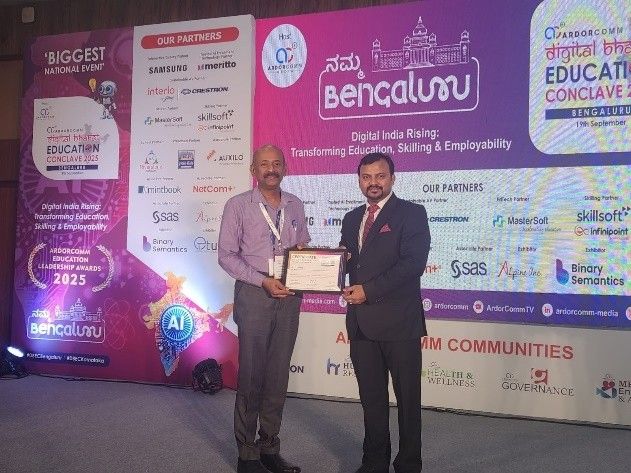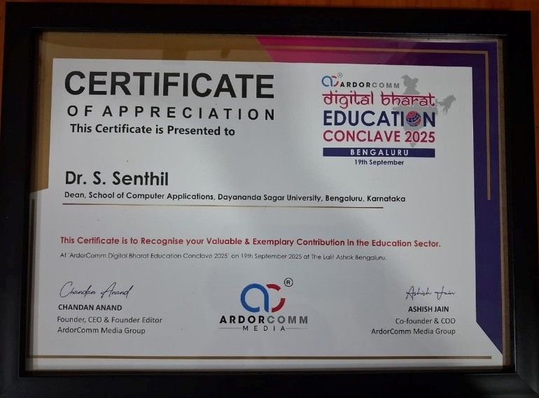 Dr. S. Senthil, Dean, School of Computer Applications, Dayananda Sagar University, has been honored with a Certificate of Appreciation by ArdorComm Media Group at the Digital Bharat Education Conclave 2025, Bengaluru.