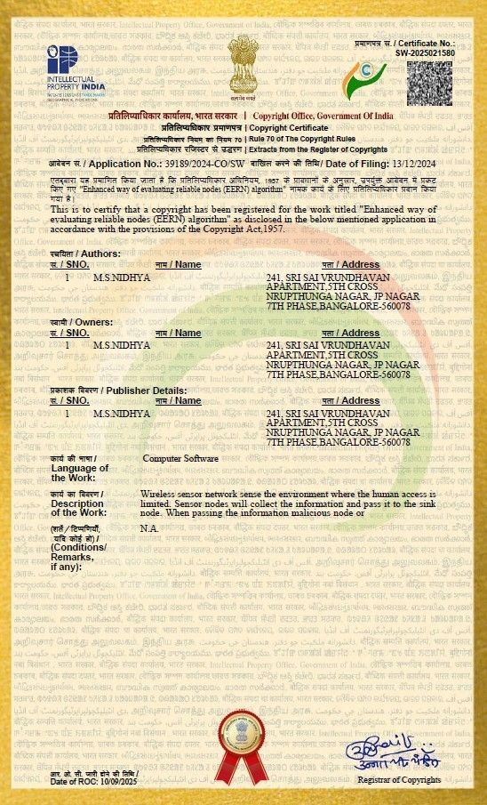 Dr. M.S. Nidhya, Associate Professor, School of Computer Applications, received a Copyright Certificate from the Government of India for her original software work titled “Enhanced Way of Evaluating Reliable Nodes (EERN) Algorithm”. This achievement highlights her contribution to innovation and research in the field of computer networks and software engineering.