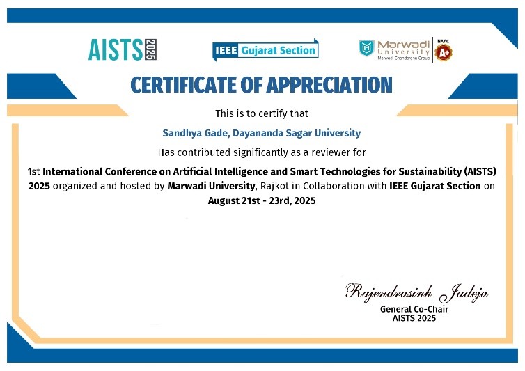 Dr. Sandhya Madhuri, Assistant Professor, School of Computer Applications, Dayananda Sagar University, served as a Reviewer for the IEEE International Conference on Artificial Intelligence and Smart Technologies for Sustainability (AISTS) organized by Marwadi University. She extends her gratitude to Marwadi University for the opportunity and to Dayananda Sagar University for their continuous support.