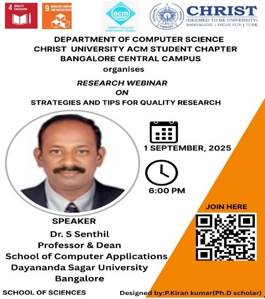 We are proud to share that Dr. S. Senthil, Professor & Dean, School of Computer Applications, Dayananda Sagar University, Bangalore, was invited as the distinguished speaker for a Research Webinar on “Strategies and Tips for Quality Research” organized by the Department of Computer Science, CHRIST University ACM Student Chapter, Bangalore Central Campus on 1st September 2025.