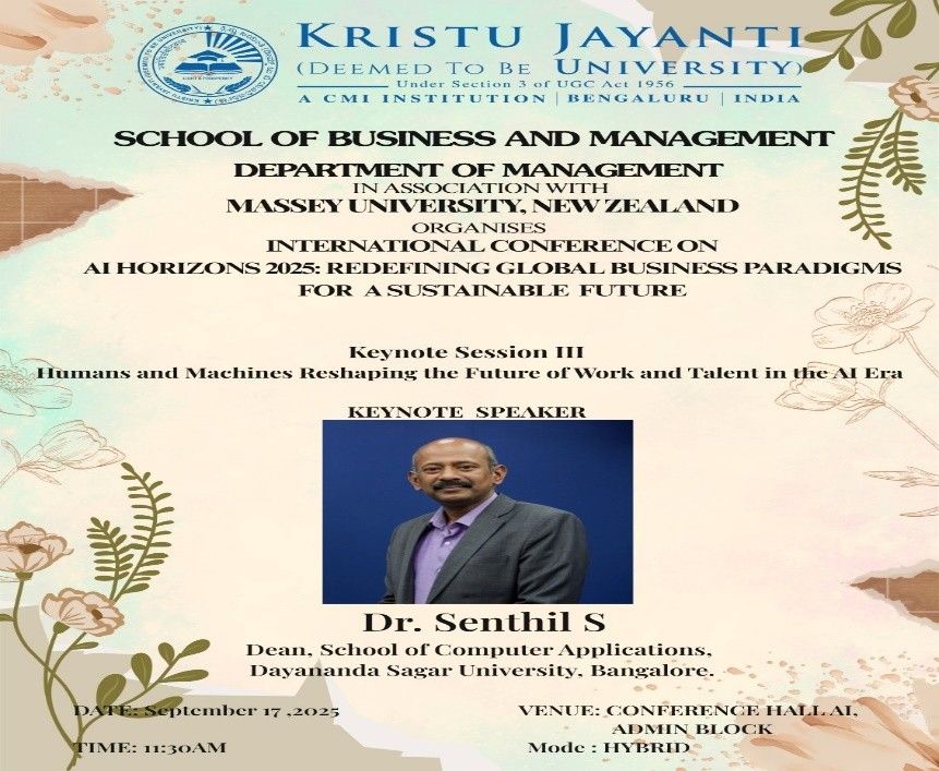 Dr. S. Senthil, Dean, School of Computer Applications, Dayananda Sagar University, served as a Keynote Speaker at the International Conference on “AI Horizons 2025: Redefining Global Business Paradigms for a Sustainable Future”, organized by the Department of Management, Kristu Jayanti University, in association with Massey University, New Zealand.