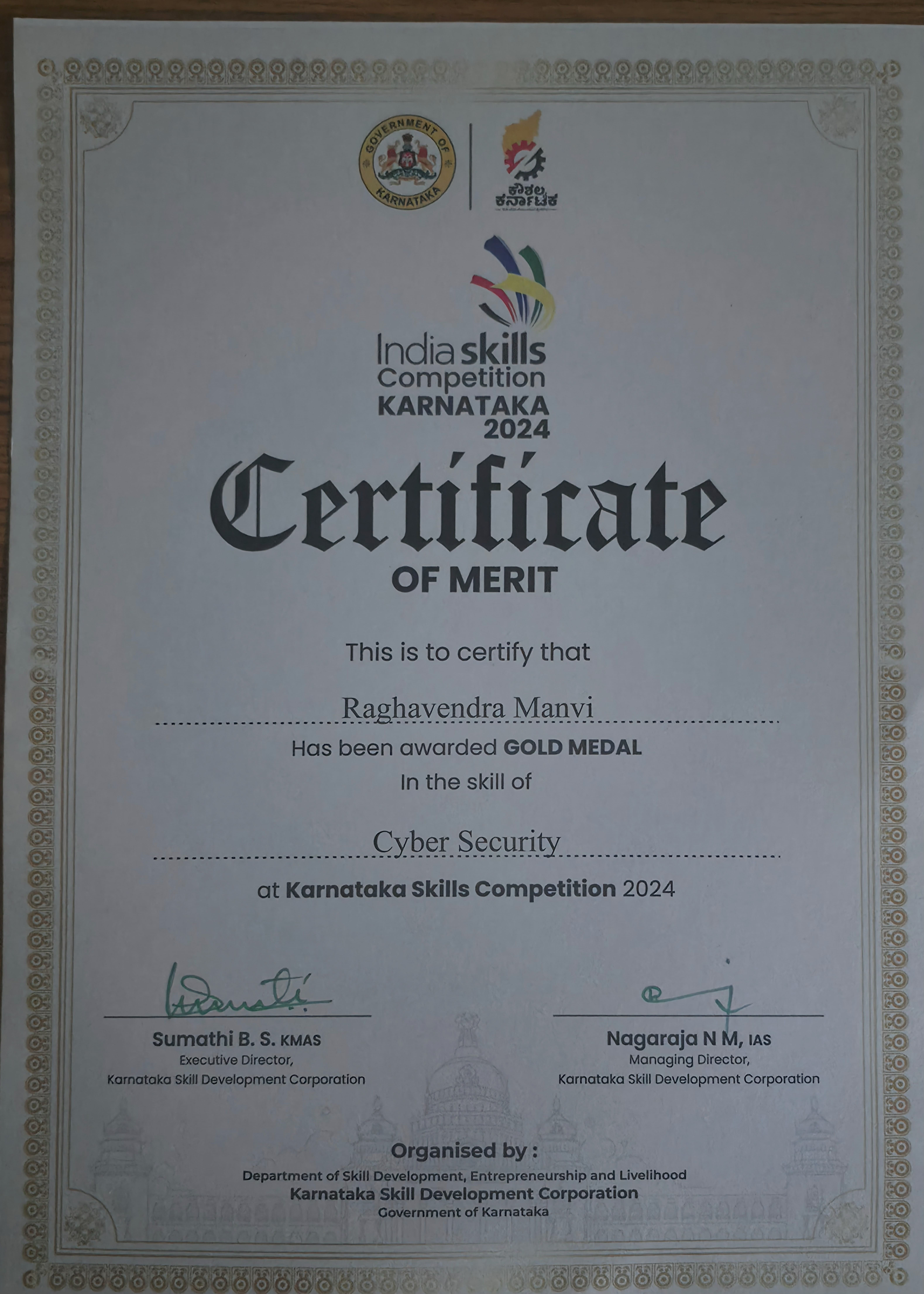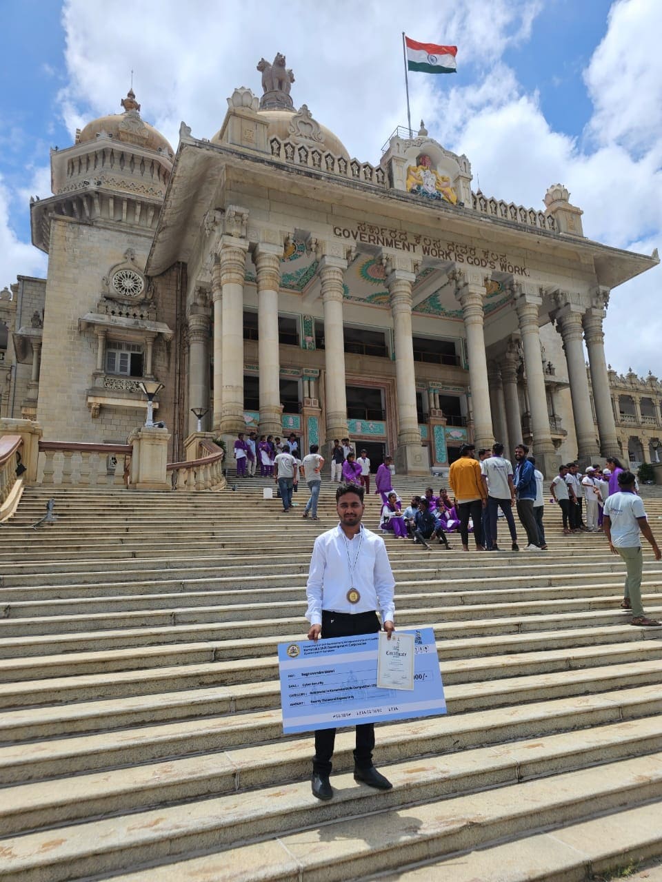 Raghavendra Manvi, a student of MCA 2nd Semester, brought pride to the School of Computer Applications by securing the State Level Gold Medal in the domain of Cybersecurity at the Karnataka Skills Competition 2024, held as part of India Skills 2024. Organized by the Department of Skill Development, Entrepreneurship and Livelihood under the Karnataka Skill Development Corporation, the prestigious event culminated in a grand prize distribution ceremony at Banquet Hall I, Vidhana Soudha, Bengaluru, on 14th July 2025. Raghavendra was awarded a cash prize of ₹20,000 in recognition of his outstanding skills and performance, marking a significant achievement both for him and the institution.