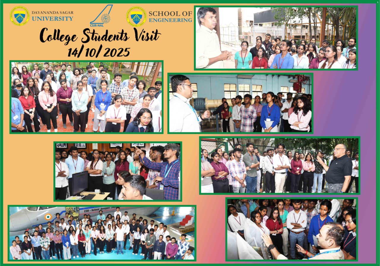 On 14/10/2025 Department of Aerospace Engineering at Dayananda Sagar University organised an industrial visit to CSIR-National Aerospace Laboratories (CSIR-NAL). The students from III and IV year witnessed Trisonic wind tunnel, Turbine blade testing, propulsion testing facility and Saras hangar.