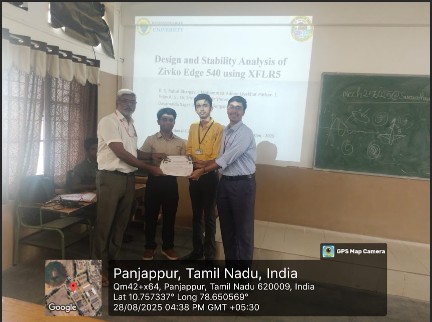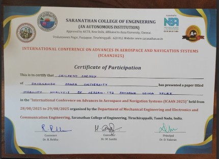Final-year Aerospace Engineering students—Rahul Bhargav, Tejas A. S., Adnan Likhiyat Pathan, Srilaxmi Shenoy, Krish Agrawal, Khyati Choubey, Ashvani Choudary, Jaiman Khandelwal, Vishesh Soni, and Aagnayee Biswas—actively participated in the International Conference on Advances in Aerospace and Navigation Systems (ICAAN-2025) hosted by Saranathan College of Engineering, Tamil Nadu, on August 28, showcasing the department's focus on research-driven learning and technical innovation.