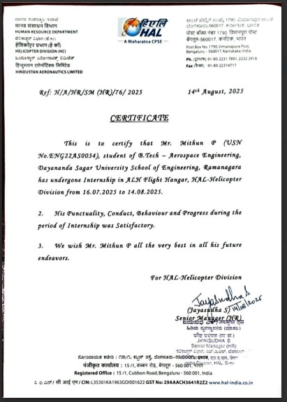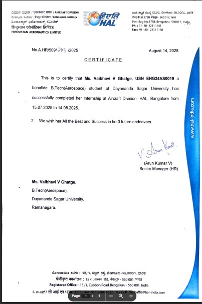 - Ms. Kushika B completed an internship at Hindustan Aeronautics Limited (HAL), Overhaul Division, Bengaluru.