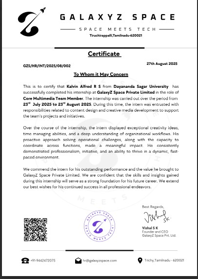 - Kalvin Alfred R S completed an internship at GalaxyZ Space Private Limited.