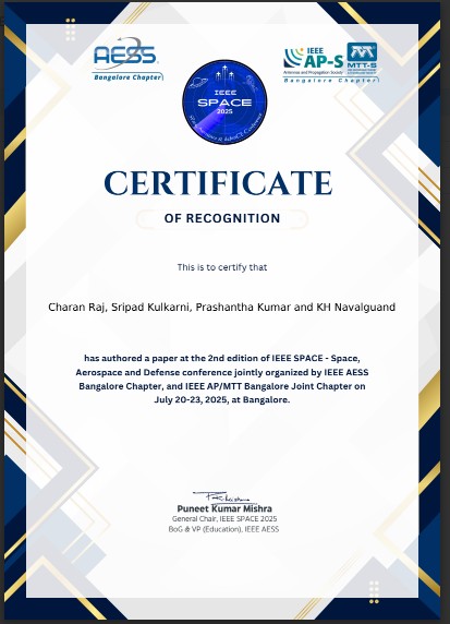 On July 21, Dr. Prasanthakumar H. G., Assistant Professor, presented a research paper titled "Design and Analysis of PCB-Integrated 1U CubeSat Structure for Enhanced Payload Capacity" at the IEEE Space Conference 2025. The paper was co-authored by Prof. Sripad Kulkarni and Mr. Charan Raj.