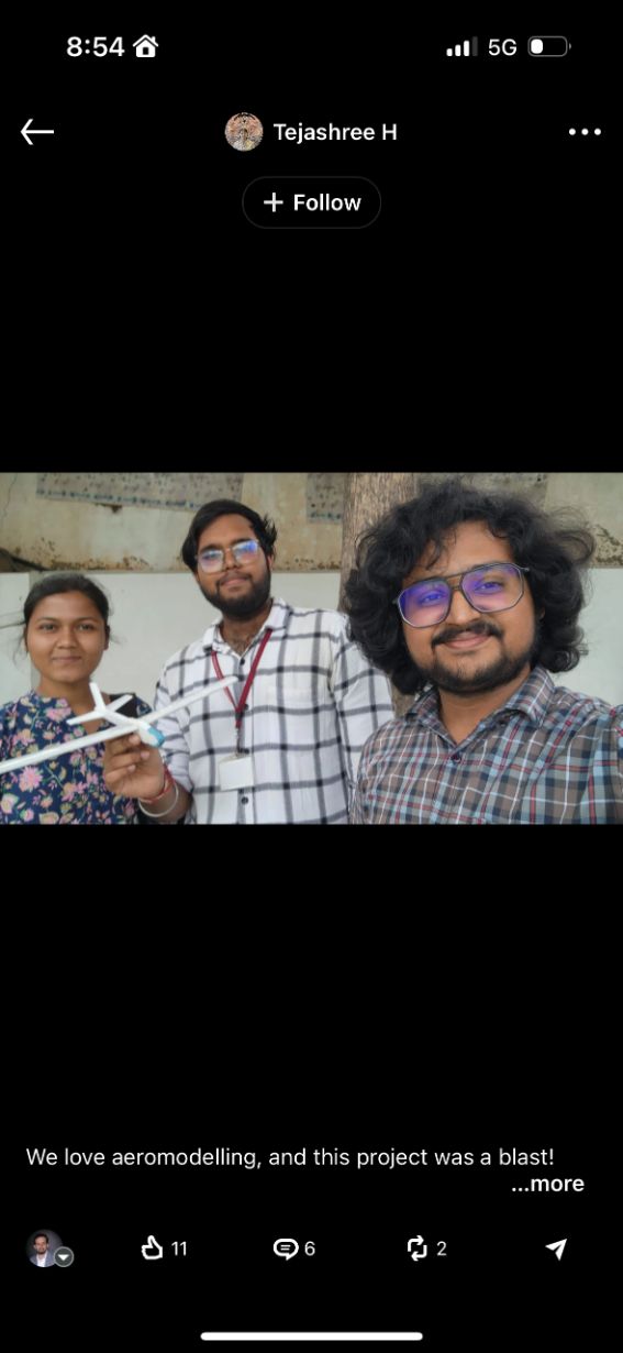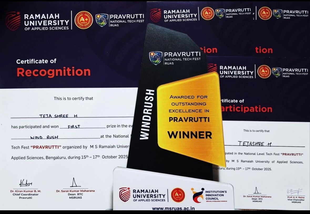 Tejashree H ENG23AS0022, RISHAB PRAVEEN BADIGER ENG23AS0015 and AYAN SAMANTA ENG23AS0041 students from III year Department of Aerospace Engineering Dayananda Sagar University secured First Prize in the event “Wind Rush” at the National Level Tech Fest “Pravrutti”, organized by M. S. Ramaiah University of Applied Sciences, Bengaluru, held from 15th to 17th October 2025. The event showcased innovative aeromodelling projects, and teams outstanding performance demonstrated technical excellence and creativity in aerospace design.