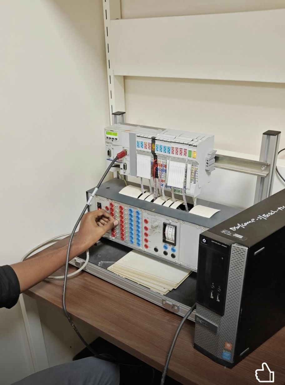 The laboratory is equipped with industry-grade PLC trainers and automation hardware from leading manufacturers, along with Human–Machine Interface (HMI) panels, SCADA integration tools, variable frequency drives (VFDs), sensors, and actuators. Industry-standard software platforms are used for PLC configuration, simulation, debugging, and real-time monitoring of control systems.
