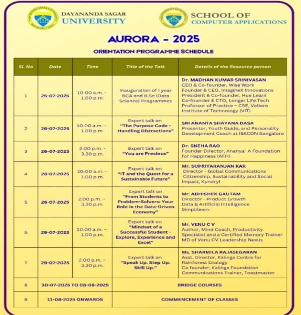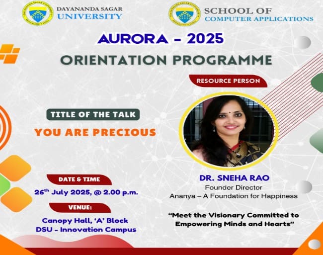 The School of Computer Applications, Dayananda Sagar University, successfully inaugurated the first-year BCA and B.Sc (Data Science) programmes through a grand multi-day orientation programme titled AURORA – 2025, held on 25th July 2025. With the theme "Step into the Light of New Beginnings", the event aimed to warmly welcome new students and familiarize them with the academic culture, values, and vision of DSU. The series featured motivational talks, expert sessions, and interactions with industry leaders and mentors to ensure a strong and inspiring start for the students.