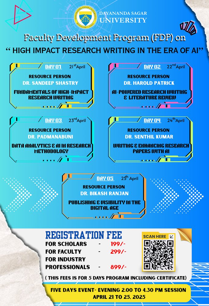 School of commerce and Management Studies, Dayananda Sagar University, Bengaluru, is organizing a 5 Day FDP on Research Methods and Data Analysis Using JMP Statistical Software’ from 26th February 2024 – 1st March 2024