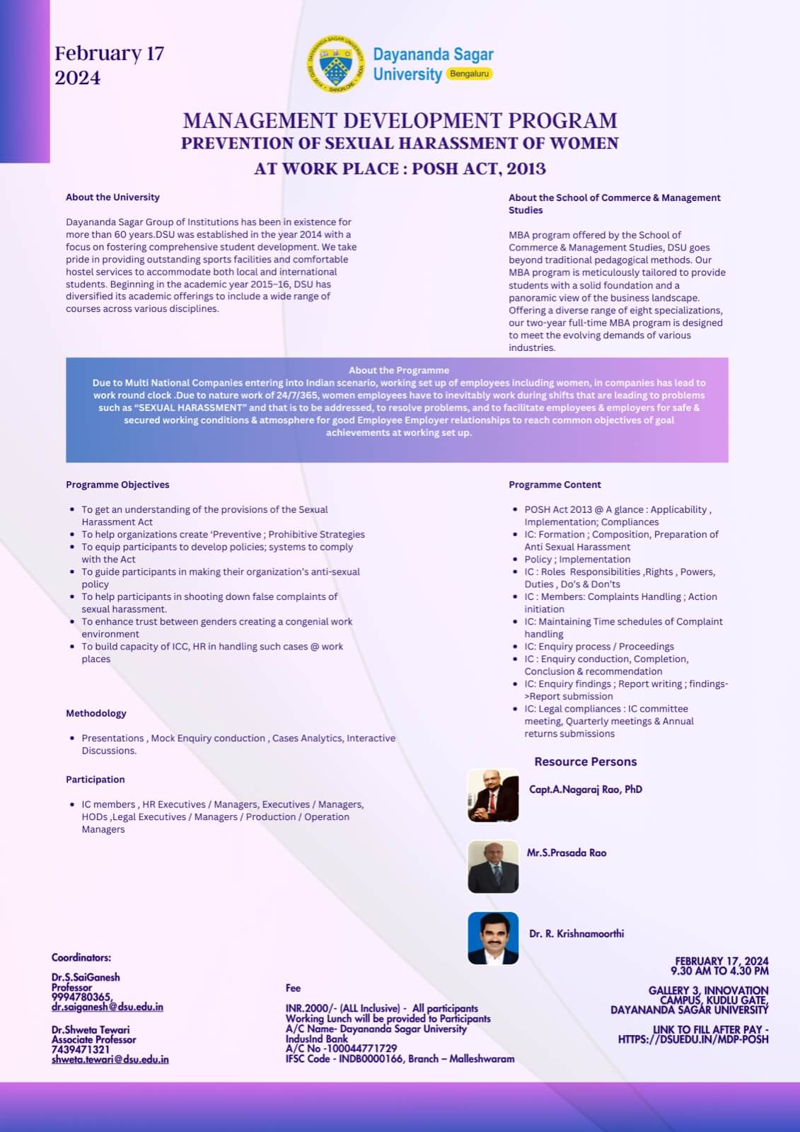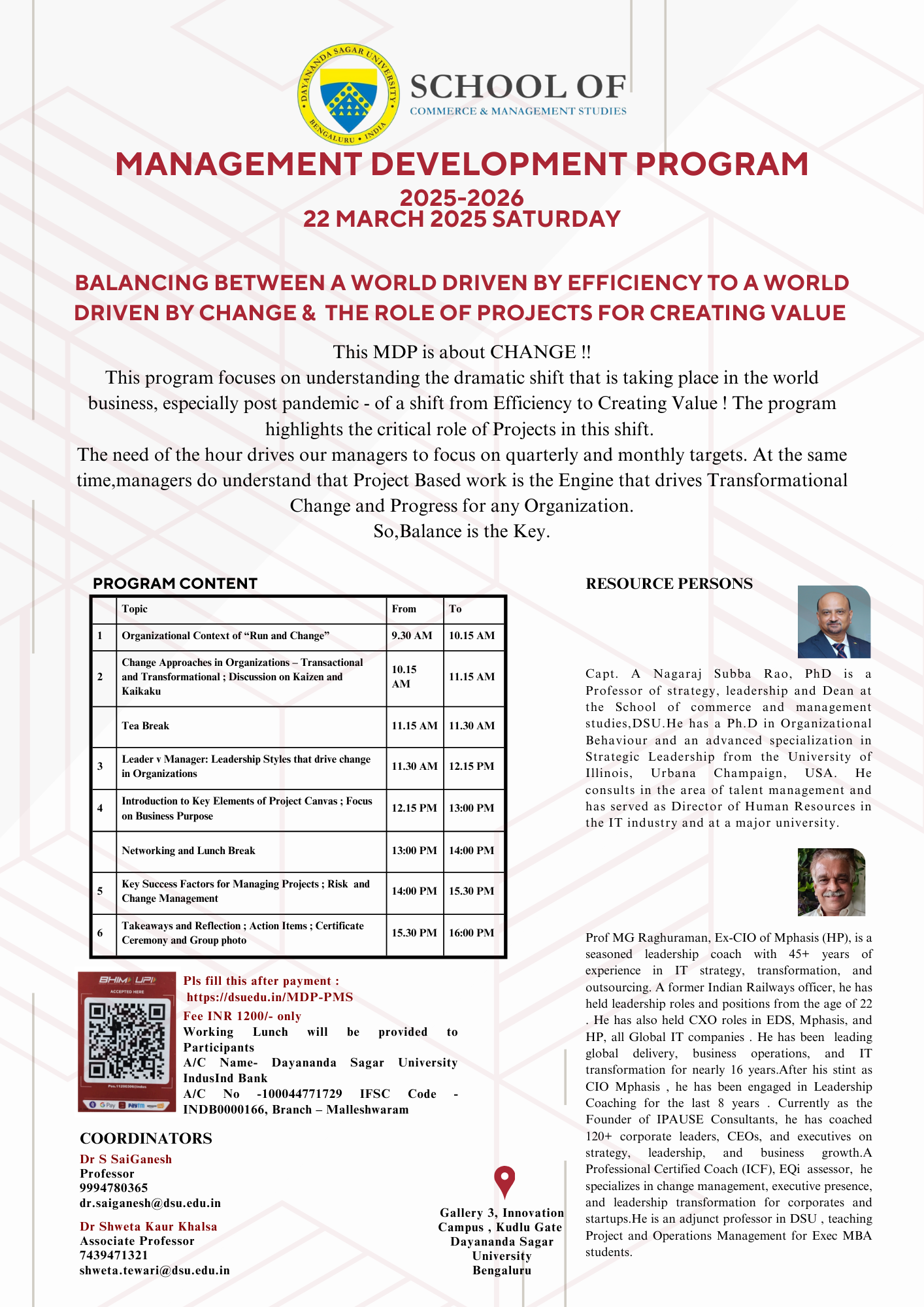 You are requested to join School of Commerce and Management Studies, City Innovation Campus, Dayananda Sagar University for this 1-DAY MDP as per below schedule.