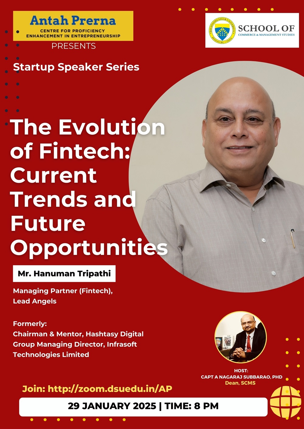 Continuing the philosophy of academic enrichment and nurturing industry ready talent, the Digital Transformation - Centre of Proficiency Enhancement (DT COPE) will equip DSU MBA students with hands-on experience on Digital tools and processes in select business domains. In this regard, this session will help connect with Industry professionals to bring practical perspectives and practices of Digital Technologies in Financial Domain for the students.
