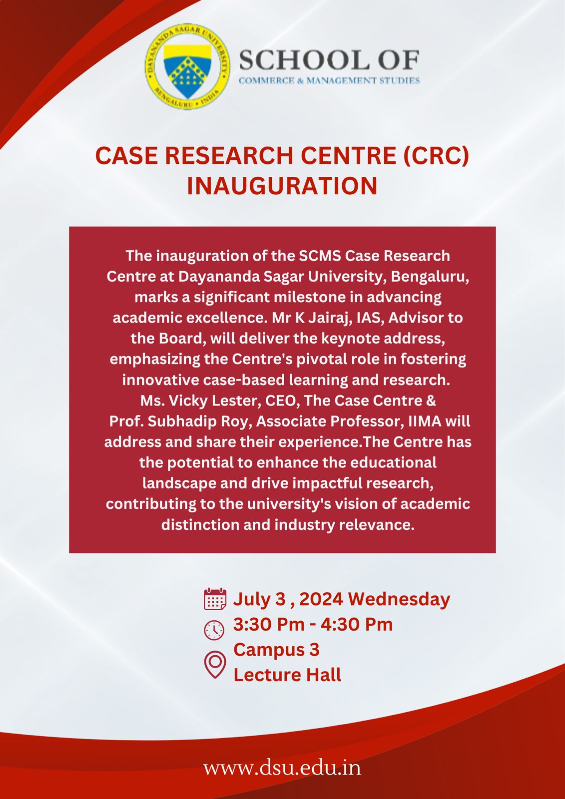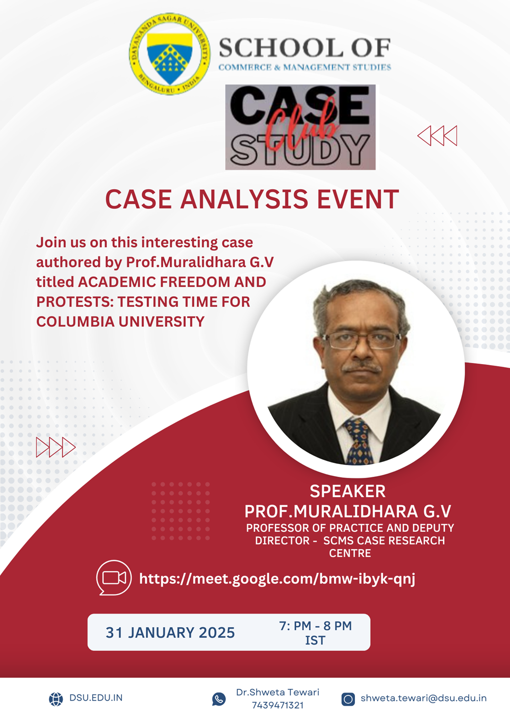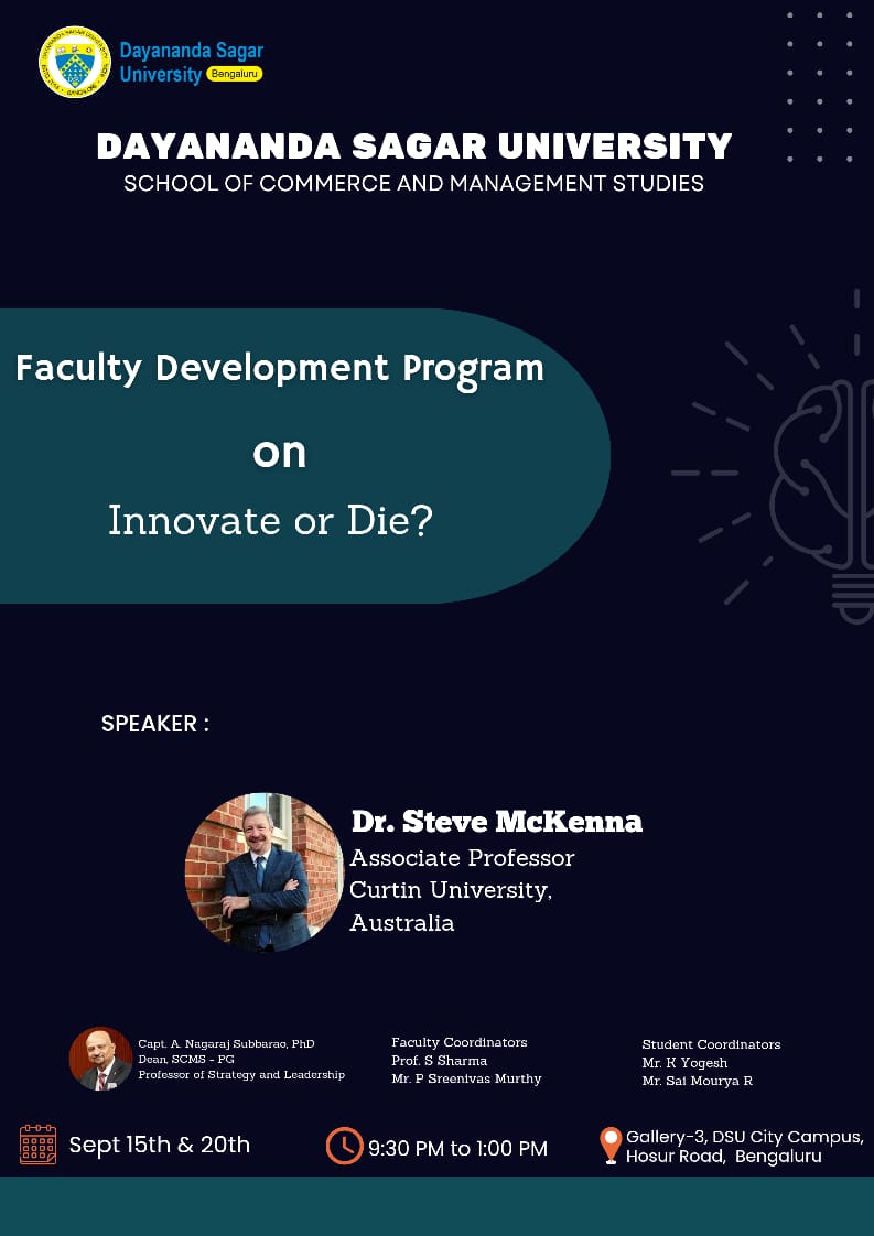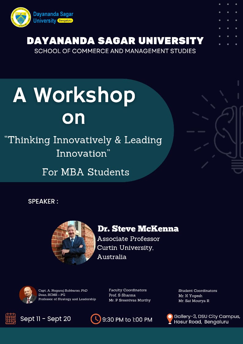 The School of Commerce and Management Studies, Dayananda Sagar University under the guidance of Prof. Capt. A. Nagaraj Subbarao (PhD), Dean -SCMS, has planned to organise an International Guest talk by Professor Steve McKenna, Curtin University, Australia. This event will be conducted from September 11–20, 2023. The international speaker will be delivering talk on topic "Thinking Innovatively and Leading Innovation" for MBA Students. Also, he will be conducting a session for SCMS faculties on topic "Innovate or Die". Prof. Steve McKenna is currently an Associate Professor of Management at Curtin University, Australia. He has Corporate management experience in the Telecommunications and Automotive industries, Global Consulting experience in all sectors, and has contributed for consulting and growth of start-ups in Singapore.