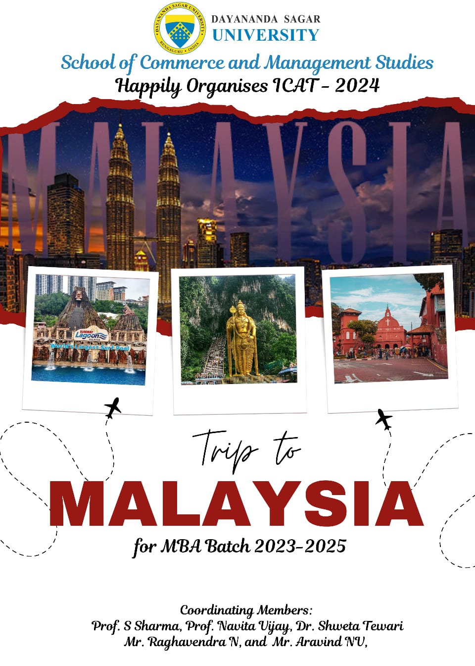 The School of Commerce and Management Studies (SCMS) at Dayananda Sagar University proudly announces an International Cultural Appreciation Tour (ICAT 2024) to Malaysia for MBA second semester students from the 2023-25 batch. The duration of the tour is from 24th July to 29th July 2024.