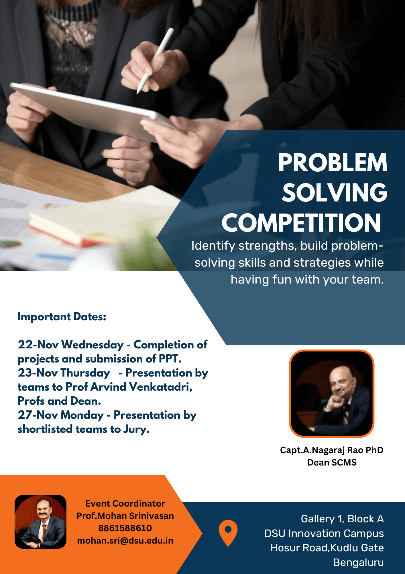 The Problem Solving Competition using TRIZ model is being held on 27th Nov Monday. This initiative is under the Problem Solving Pillar and will enhance the problem solving skills of students. Problems have been identified by the groups and they will use the TRIZ model, which is a systematic methodology for solving complex problems and generating innovative solutions. The teams, who are mentored by SCMS professors, will present to the jury and top two teams will be recognized and given certificates by Dean.