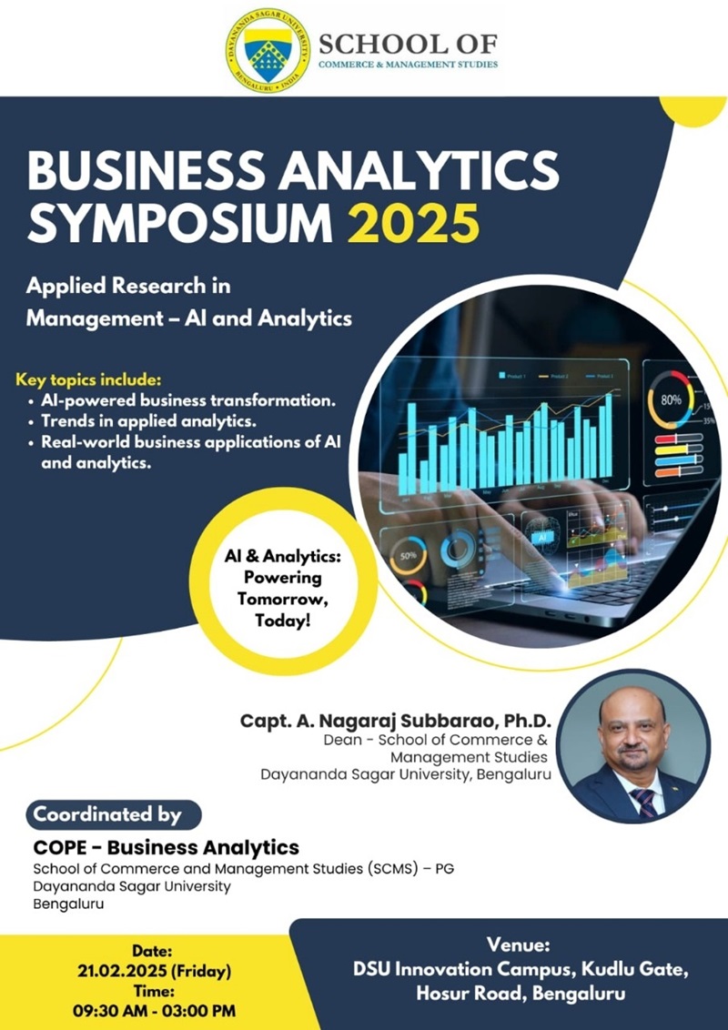 Dayananda Sagar University - School of Commerce & Management Studies (PGP) endeavours to transform the way we deliver valuable education to our students by knowing these challenges and imbibing new technologies in our curriculum. Keeping this objective in mind, under the guidance of Dean- SCMS, Capt. A. Nagaraj Subbarao, PhD, proudly announces ANALYTICS CONCLAVE on theme “Future of Work” wherein eminent industry experts are going to share invaluable knowledge about futuristic work environment and needed skills.