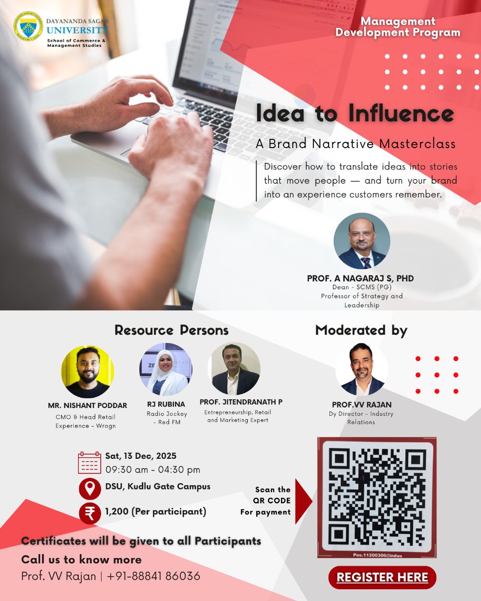 “Ideas to Influence – A Brand Narrative Masterclass” is a one-day MDP designed to help participants understand how powerful narratives shape brand identity, communication, and customer connection. Scheduled for 13th December 2025 at the DSU Kudlu Gate Campus (9:30 AM – 4:30 PM), this masterclass brings together three dynamic resources: Prof. Jiten Patri, Nishant Poddar (CMO, Wrogn) and RJ Rubina Patel (Red FM). Through engaging sessions and hands-on activities, participants will learn how to craft meaningful brand stories, build a strong personal and professional presence, and use voice, creativity, and strategy to create lasting influence. Open to students, alumni, marketing professionals, and leaders, this MDP offers a unique opportunity to elevate your brand and communication skills.